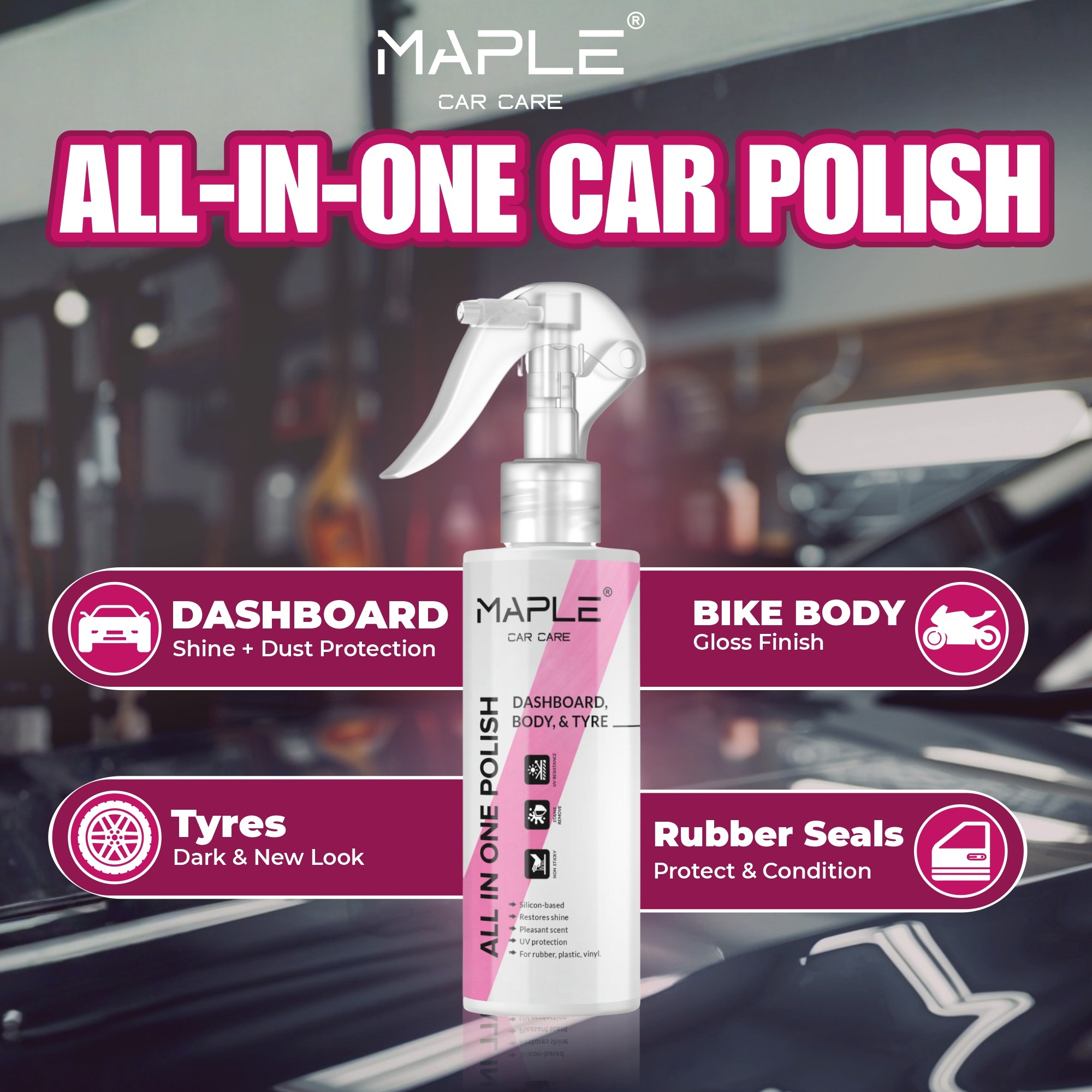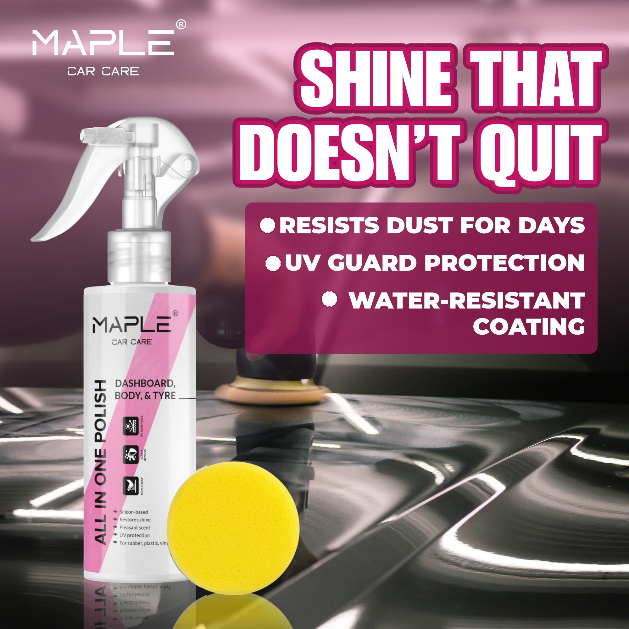 Ready-to-use, high-shine dresser for cars and bikes. Safe for interior